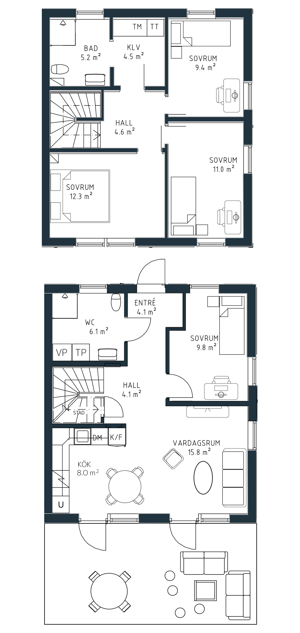 På övervåningen finns ett luftigt allrum med vackert ljusinsläpp, perfekt för avskilt umgänge och vila. I anslutning ligger två sovrum och ett master bedroom med walk-in-closet, som bidrar till en känsla av rymd och bekvämlighet. Här finns även ett badrum med dusch, wc och kommod, i samma stil som badrummet på entréplanet.