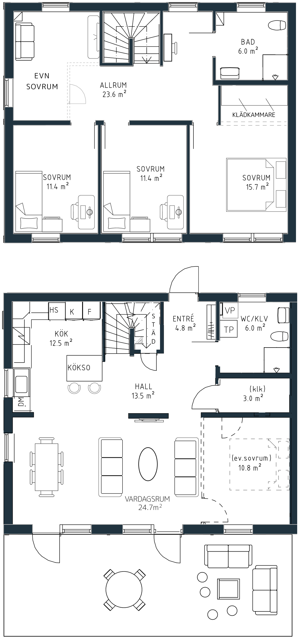 Planlösningen leder vidare till ett öppet rum med långa siktlinjer och sociala ytor, perfekt för mysiga stunder med familj och vänner. Köket binder samman matplatsen och vardagsrummet, och är utrustat med slitstarka Siemens-vitvaror samt tidlös design i samarbete med HTH. Integrerade vitvaror ger ett stilrent uttryck, och köksön skapar en naturlig avskiljning samtidigt som den bjuder in till umgänge och middagar. Från kök och vardagsrum nås en stor terrass – idealisk för uteliv och avkoppling. Planlösningen kan enkelt anpassas efter familjens behov.